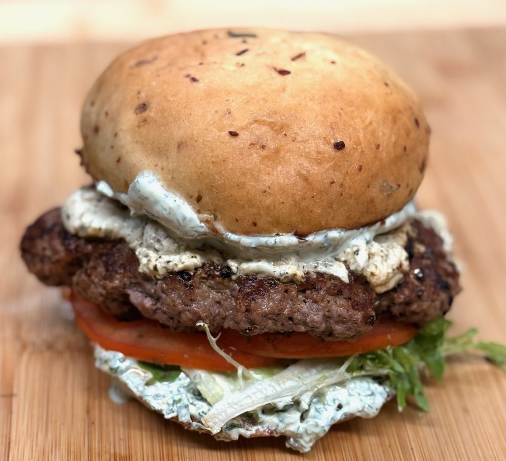 1/2 lb Maple Hill Farm Lamb Burger topped with garlic & herb goat cheese, mixed greens, house marinated tomatoes and a homemade green goddess dressing on a Mad Batter Rosemary Parmesan Sea Salt Bun.